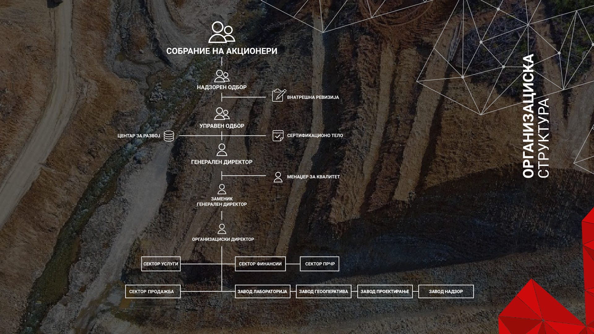 Нашата структура на управување е дизајнирана да ги негува основните принципи на работење. Културата и вредностите што ги промовира менаџментот гарантираат одржување на највисоките стандарди на деловно однесување и промовираат долгорочен успех на компанијата.